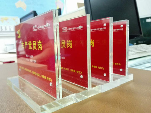为亮明党员身份,使党员同志增强自我约束、自我激励的意识,进一步接受群众的监督,发挥好先锋模范作用,公司给每位党员同志制作了“共产党员岗”桌牌,并发放了党徽。
